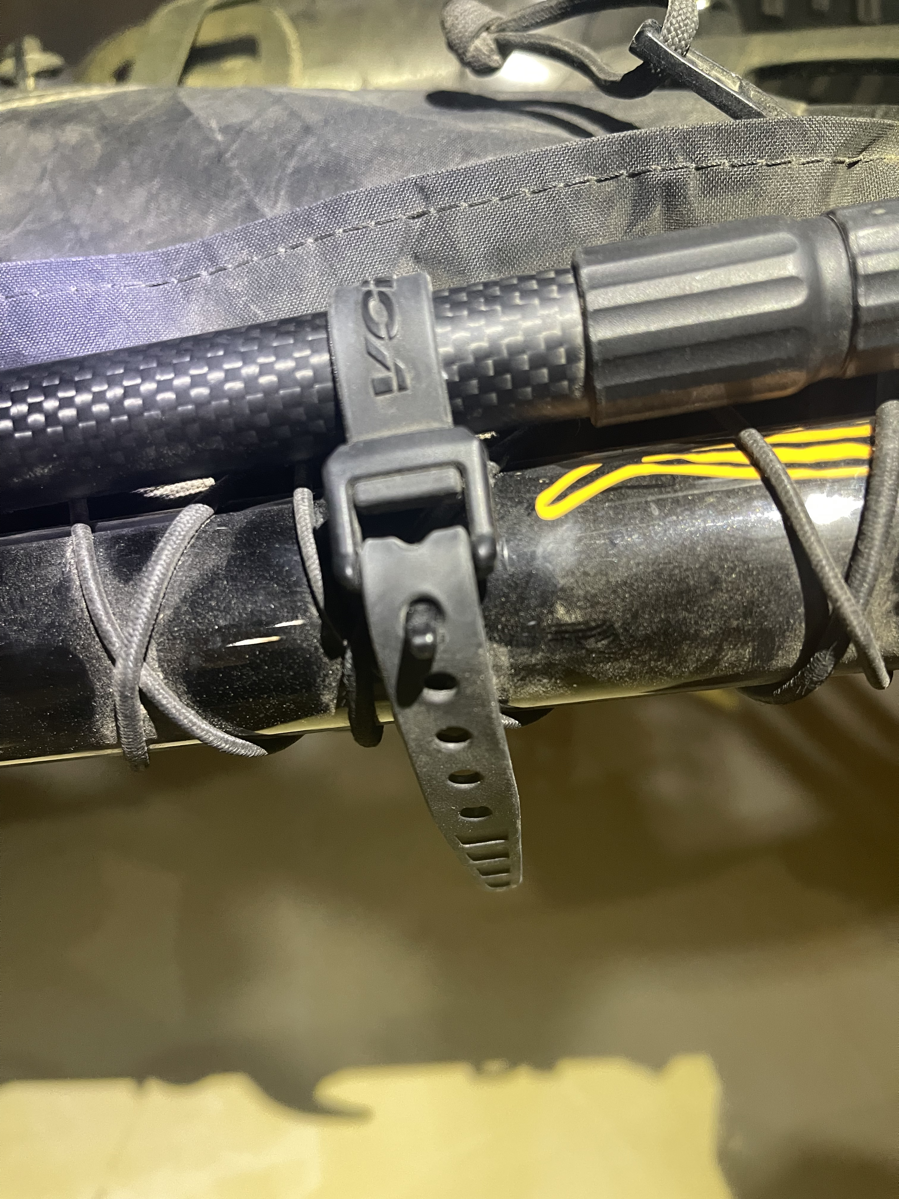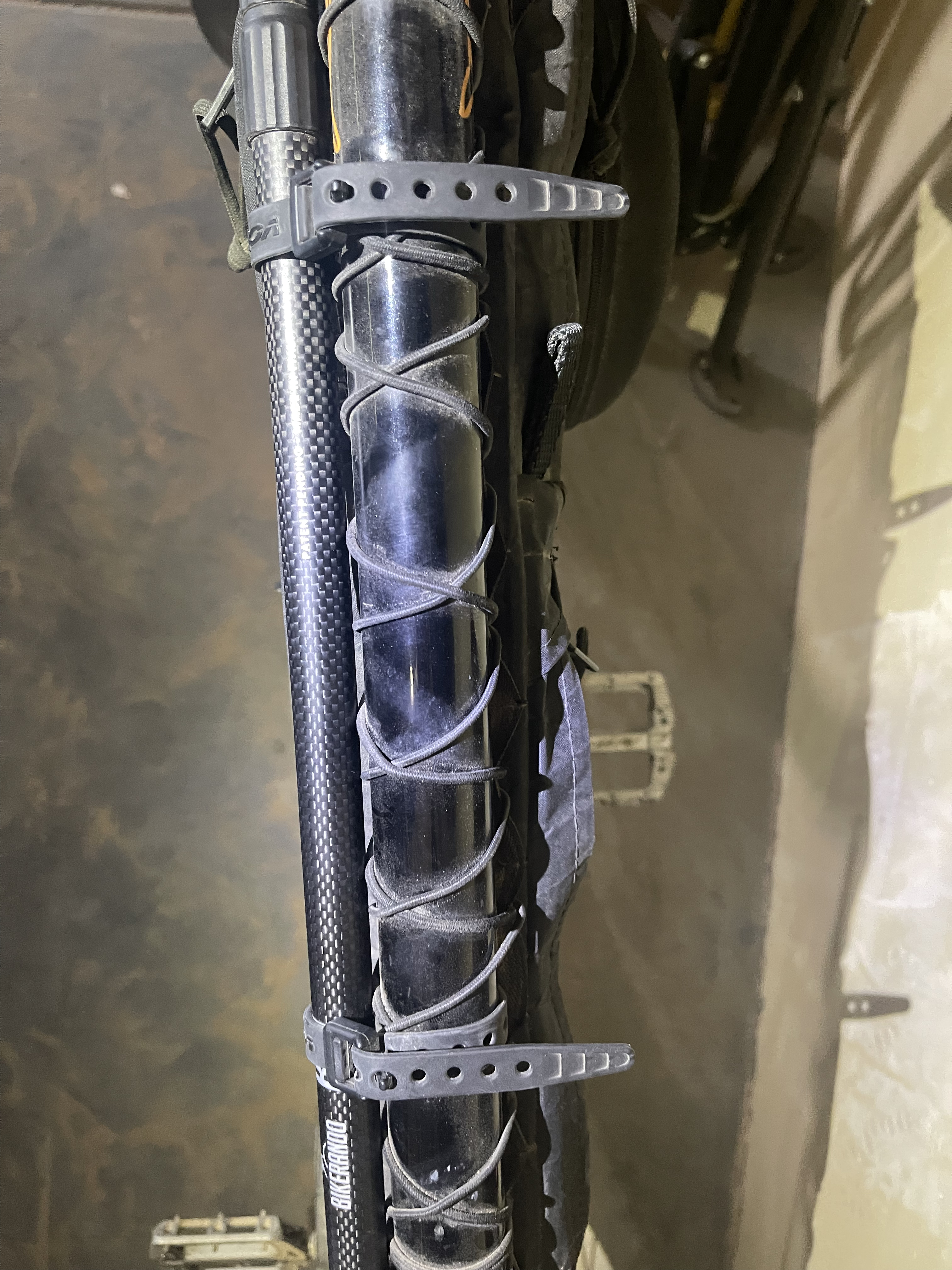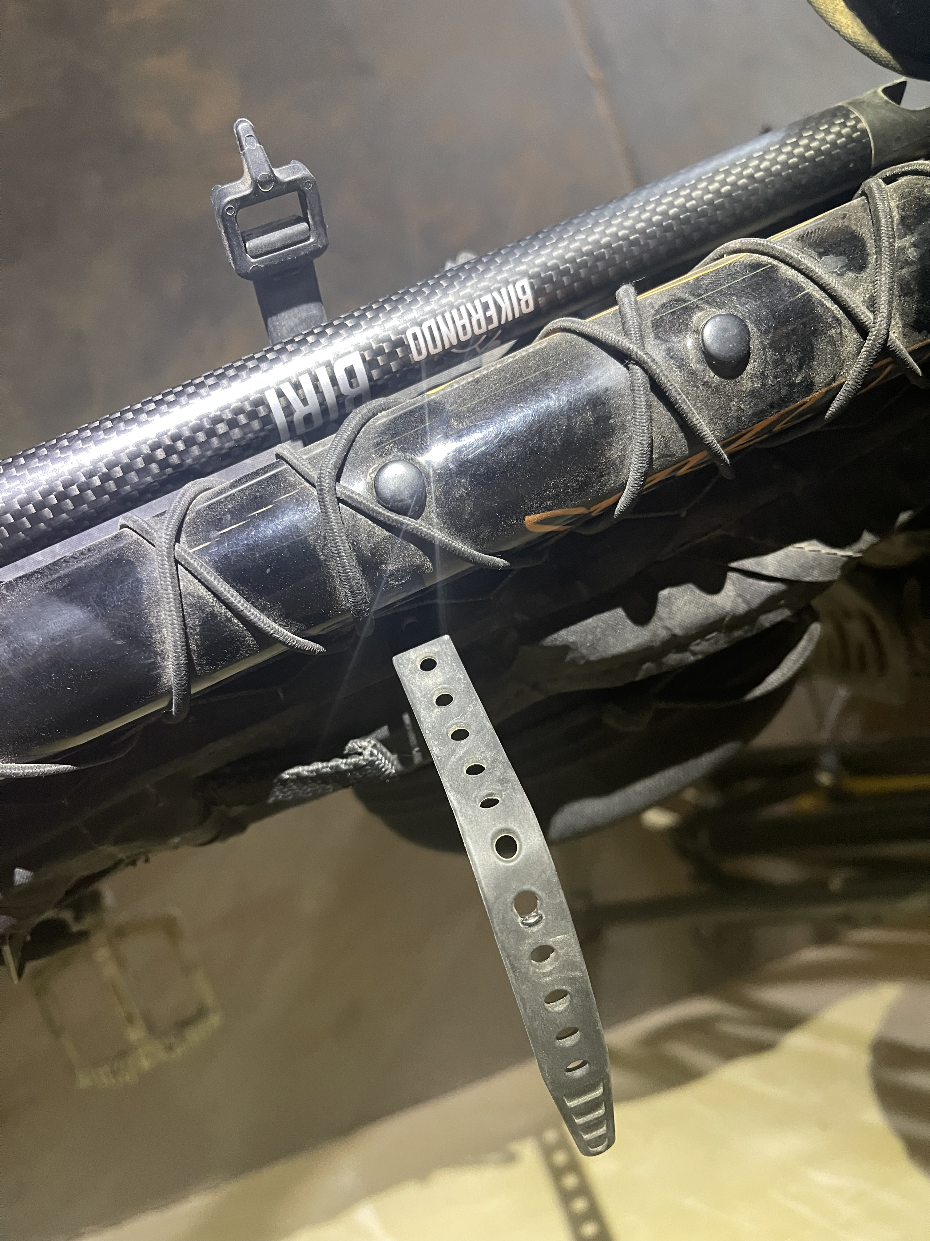 1. Eliminate the mounting clip. It doesn’t suit bikepacking bikes well, as these often have overstuffed frame bags that overlap the clip, making it difficult to reattach the BIRI. The small Velcro strap connected to the clip becomes hard to reach and usually requires two hands to secure. Even when clipped in and strapped, the pole still feels a bit wobbly and unstable in the mount. It also doesn’t feel very solid and considered the rough heavy duty usage that bikepacking gear needs to bear, we fear it could brake easily and this could happen without the rider noticing it causing the loss of the bikestand. We replaced the mount with two simple, narrow 9-inch Voilé straps, which work extremely well. They can be tightened and loosened with one hand, and the process is quick and efficient.