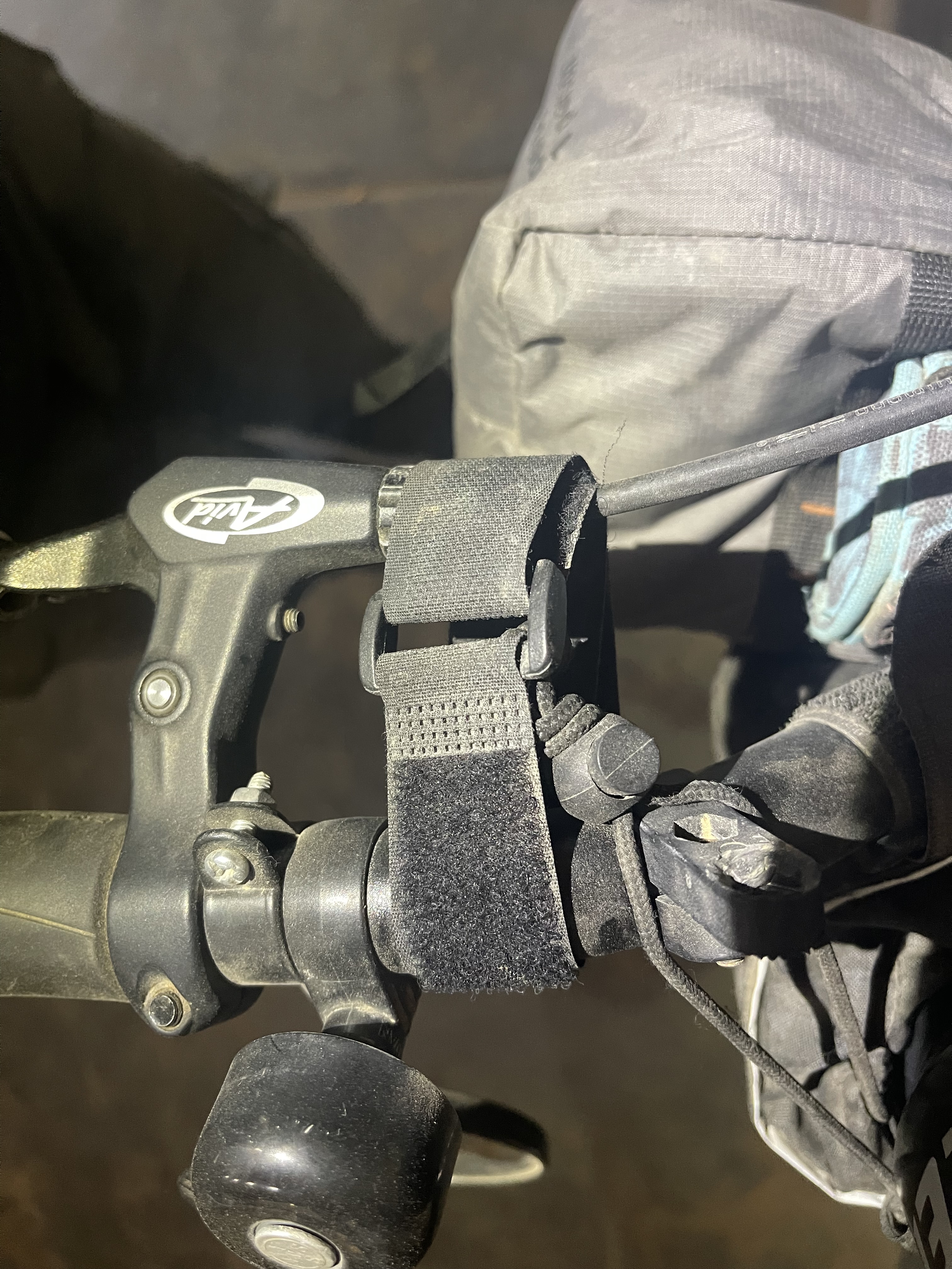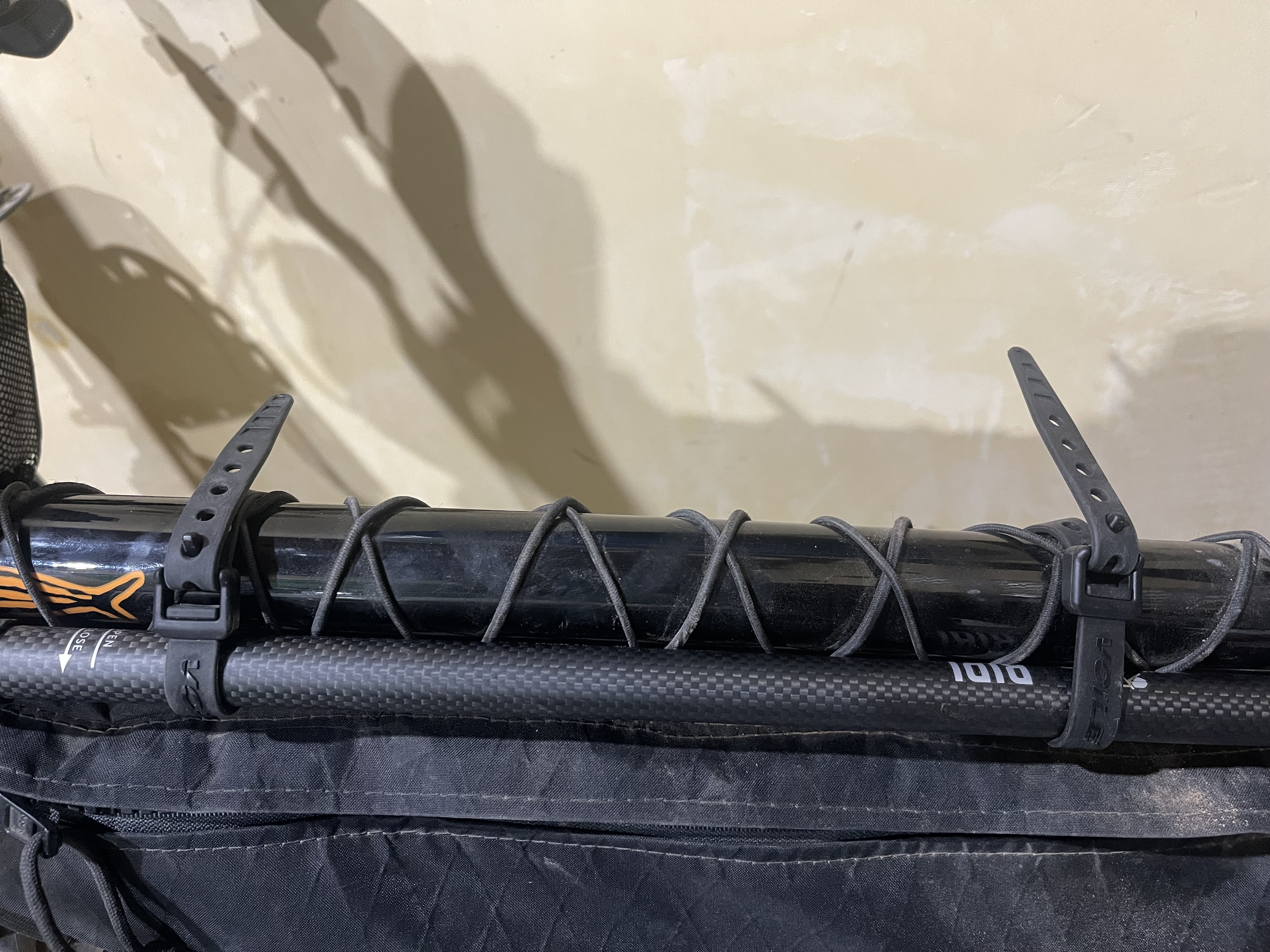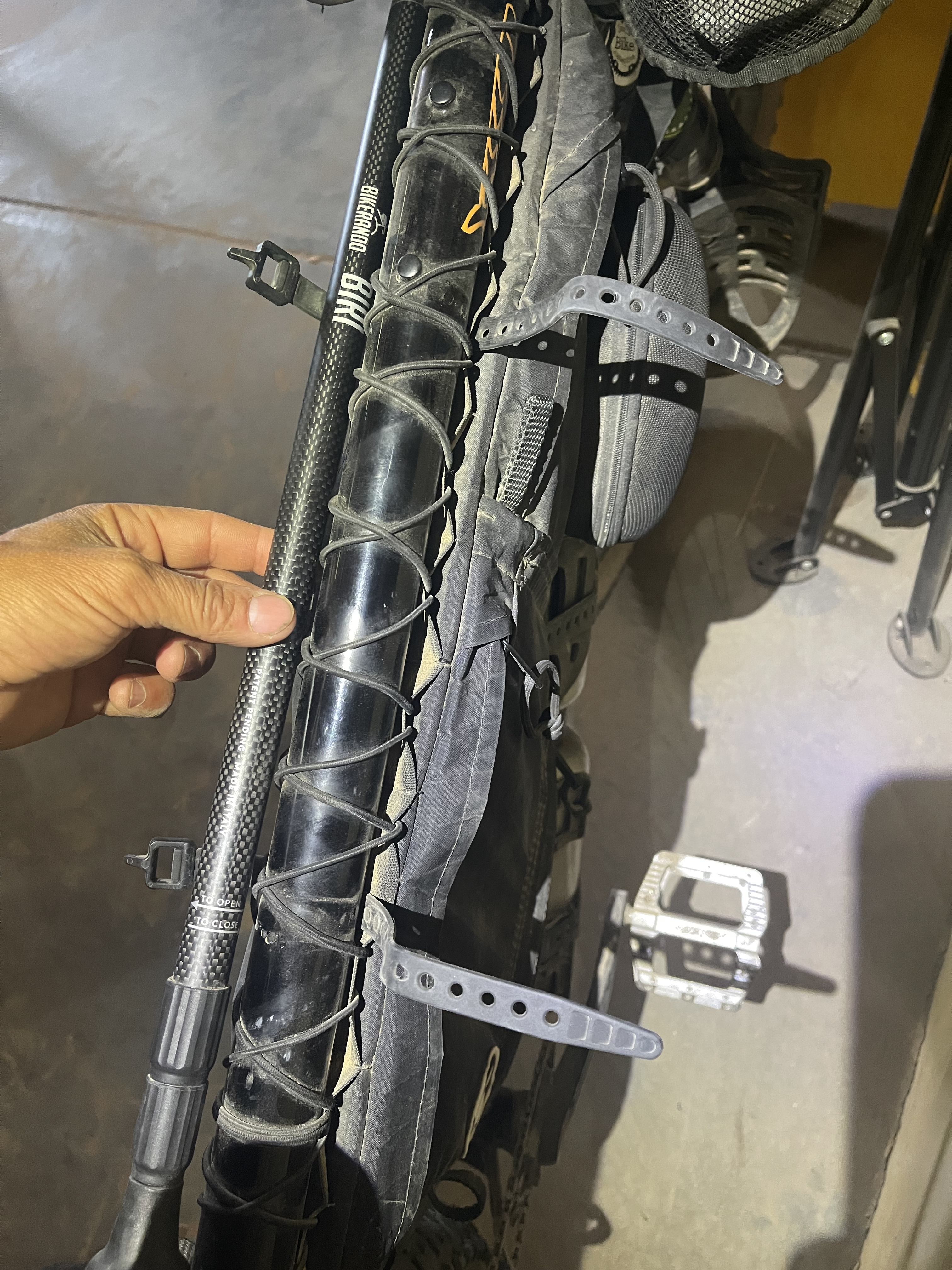 1. Eliminate the mounting clip. It doesn’t suit bikepacking bikes well, as these often have overstuffed frame bags that overlap the clip, making it difficult to reattach the BIRI. The small Velcro strap connected to the clip becomes hard to reach and usually requires two hands to secure. Even when clipped in and strapped, the pole still feels a bit wobbly and unstable in the mount. It also doesn’t feel very solid and considered the rough heavy duty usage that bikepacking gear needs to bear, we fear it could brake easily and this could happen without the rider noticing it causing the loss of the bikestand. We replaced the mount with two simple, narrow 9-inch Voilé straps, which work extremely well. They can be tightened and loosened with one hand, and the process is quick and efficient.