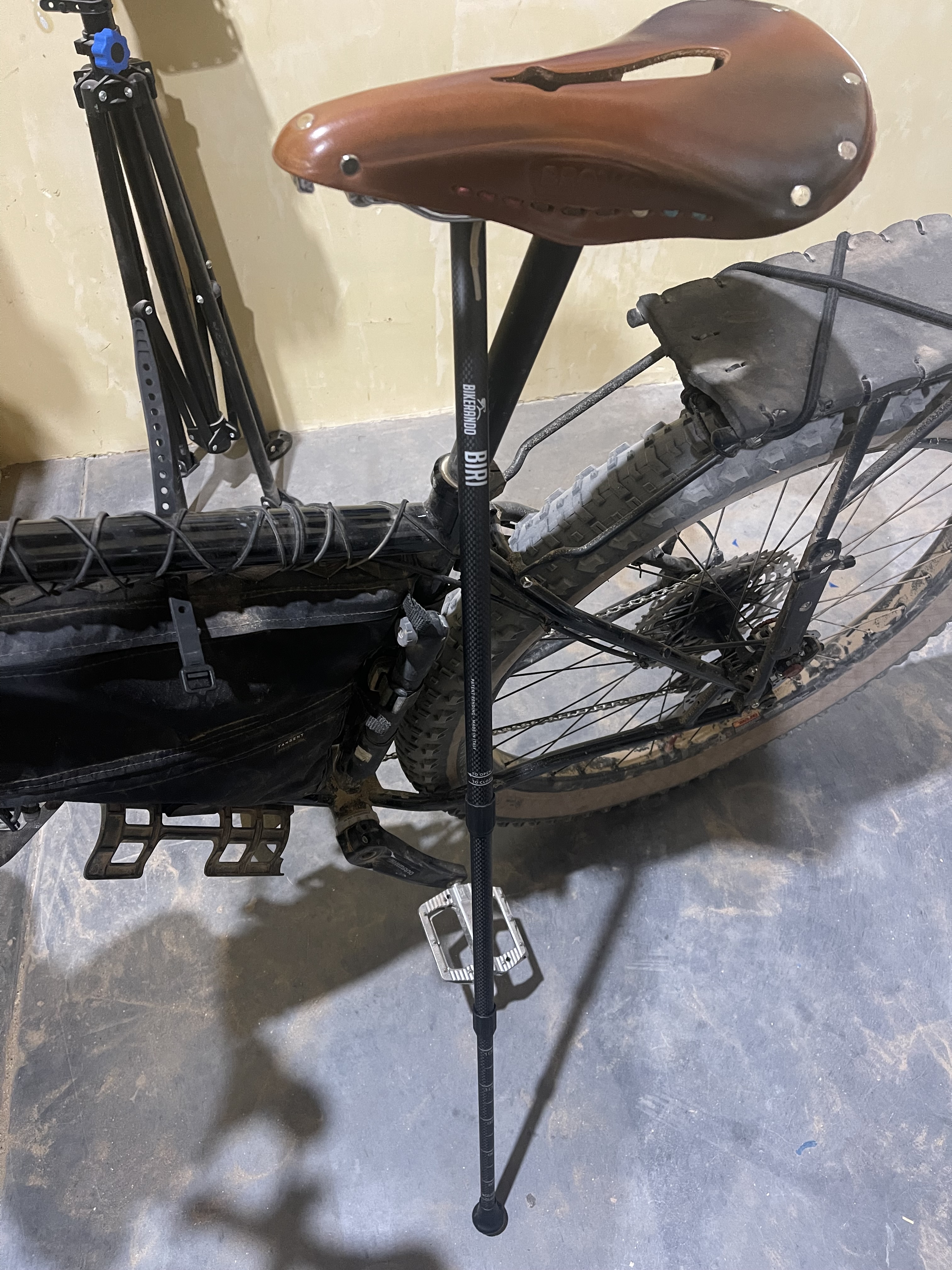 This is exactly what the BIRI is—a stick! Just like a collapsible hiking pole that can hold anything you lean on it. Why? Because the attachment point on the bike is as high as it gets (right on the saddle…..veeeery smart!), creating the strongest possible leaning angle and almost completely neutralizing the weight leverage of a loaded bike.