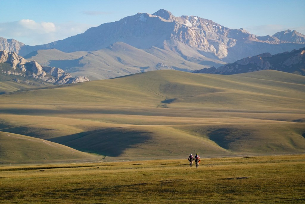Biking out of Vizcaino my left pedal was feeling a little funky so I stopped to check it out. When I unclipped the entire crank arm fell off, not good. Luckily I was leaving the town with the only bike shop for many miles and was able to cycle back into town with one crank arm. The bike shop didn’t have the correct parts I needed, but the mechanic put a quick release through to hold the assembly together. It looks pretty janky but it held up for the rest of the divide. For a highlight – I had teamed up with a German cyclist couple for a day of the Tian Shan Traverse in Kyrgystan. We had a big 2 pass day and we’re looking for a camp near water when the sun was on its way down. We descended a couple miles cross country across the grasslands with some pretty dramatic scenery.